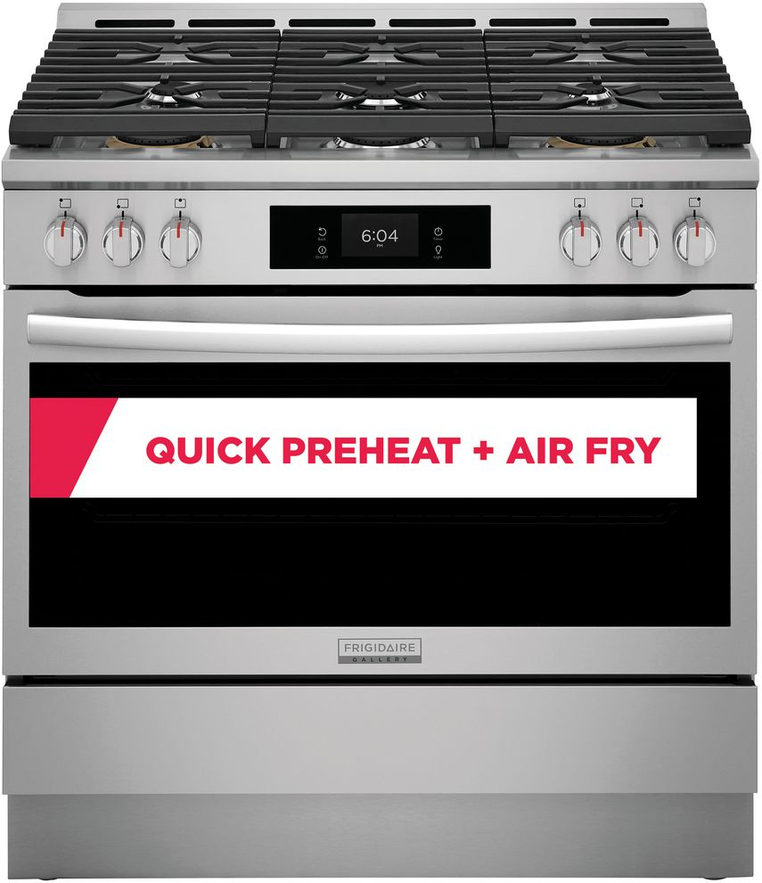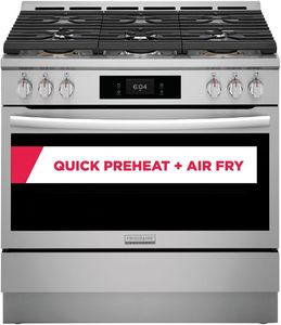 Frigidaire Gallery 36" Dual Fuel Range with Total Convection system enables cooking modes like Air Fry, Quick Preheat, Slow Cook, Steam Bake, Convection Bake and more! The flexible six burner cooktop offers ultimate cooking flexibility including two powerful 18,000 BTU Quick Boil Burners and a 5,000 BTU burner for simmering delicate foods. Dual Fuel technology offers the power of a gas cooktop and precision of an electric oven. Also includes a temperature probe and Air Fry Tray and features our fingerprint resistant, Smudge-Proof®Stainless Steel finish.