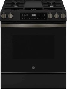 GE® 600 Series 30" Black Slate Slide-In Gas Range features EasyWash™ Oven Tray, Built-In WiFi, No Preheat Air Fry, Express Preheat, Edge-to-Edge Cooktop, Precise Simmer Burner, Center Oval Burner, Heavy-Duty, Dishwasher-Safe Grates, and Convection.Read More