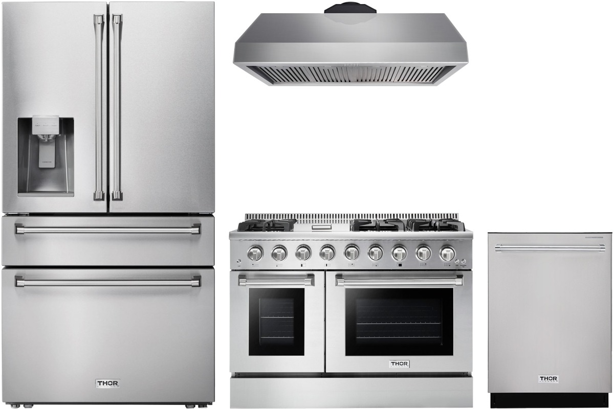 Thor Kitchen® 4 Piece Stainless Steel Kitchen Package with a freestanding gas range, French door refrigerator, wall mounted range hood and built in dishwasher.Read More