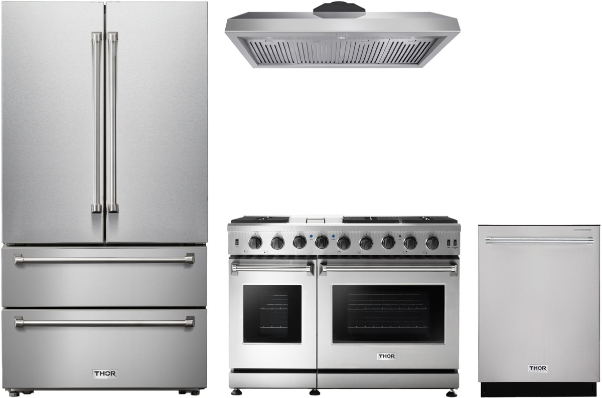 Thor Kitchen® 4 Piece Stainless Steel Kitchen Package with a freestanding gas range, French door refrigerator, wall mounted range hood and built in dishwasher.Read More